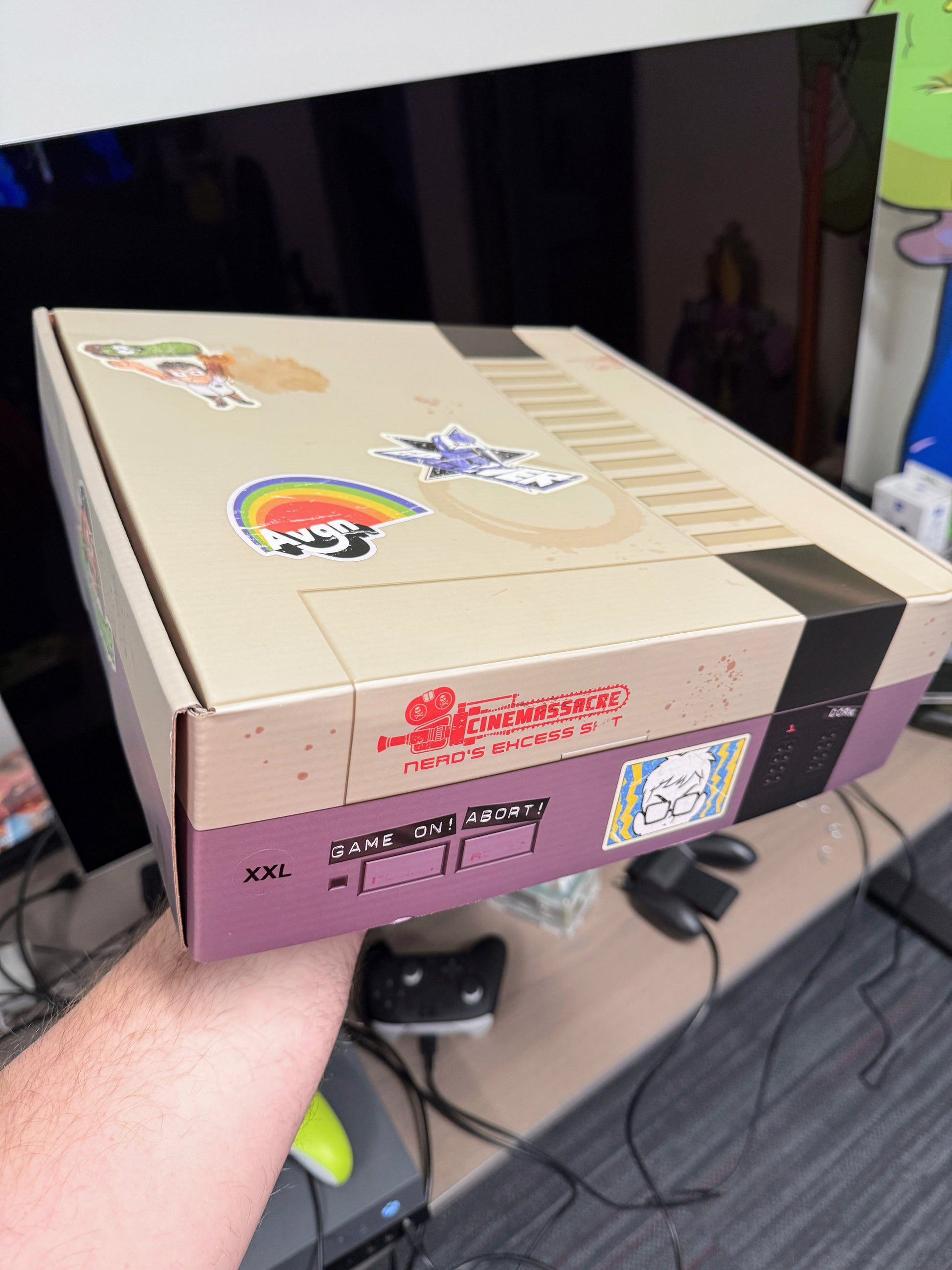 The AVGN Mystery Box contains 5 pieces of merch in a specially designed Nerd themed "NES" box. Items in the box are all randomly selected from past or present merchandise. Each box includes 5 items valued from $100 to $150 retail. The only choice you have is whether or not you want a shirt, if you select “sans shirt,” your box won’t include a shirt and will be repalced by an extra random item.