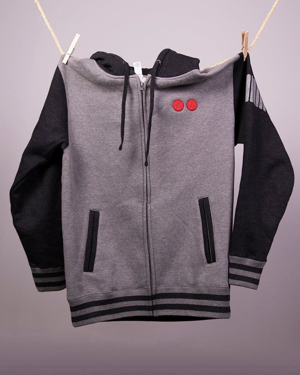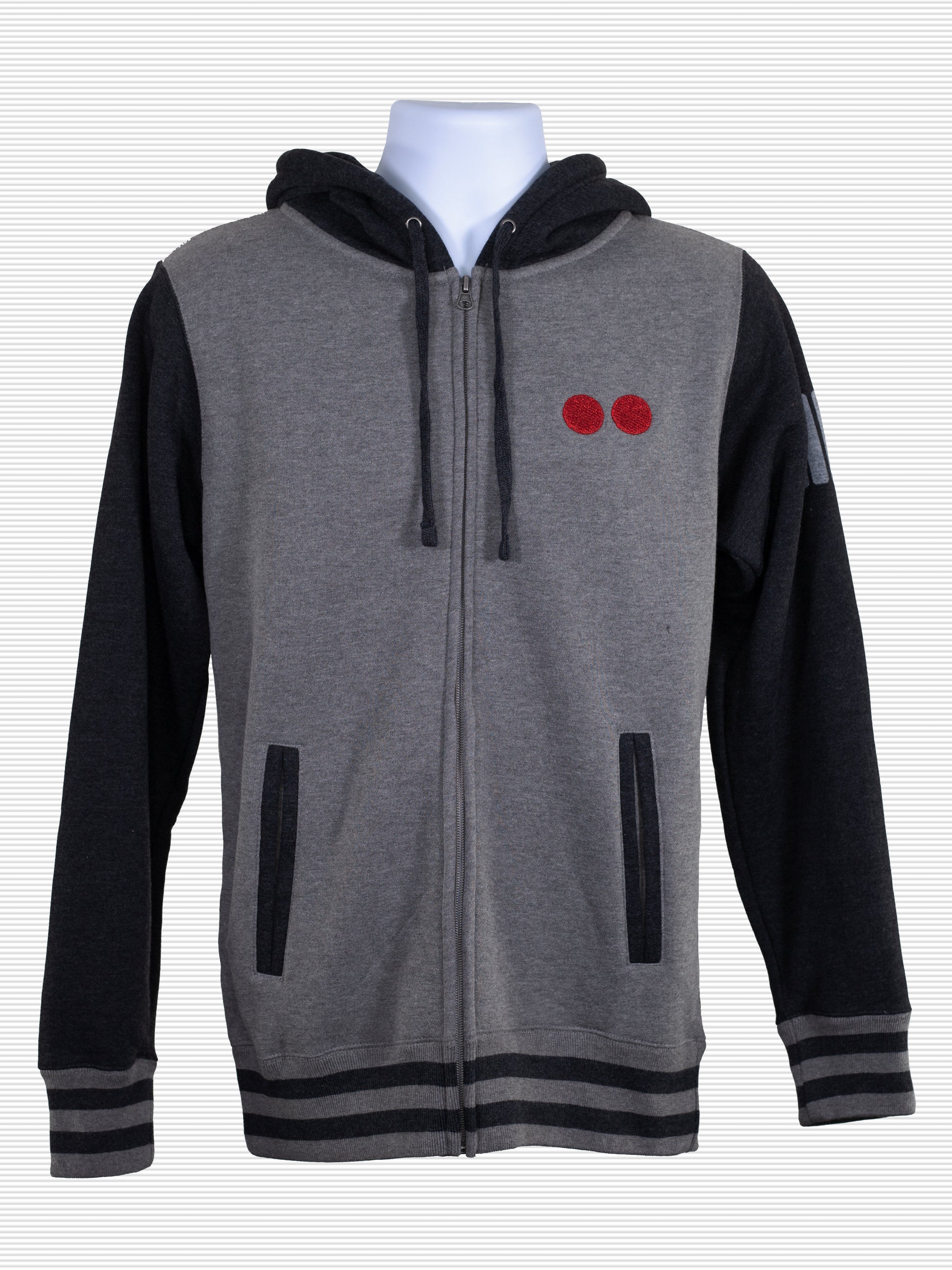A warm, heavy and soft hooded jacket embroidered with some familiar red buttons. The arm pattern and design on back were screen-printed to perfectly match the colors on the rest of the garment. Get the size you would normally get for a jacket.